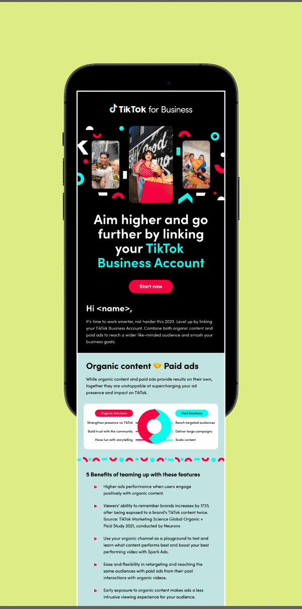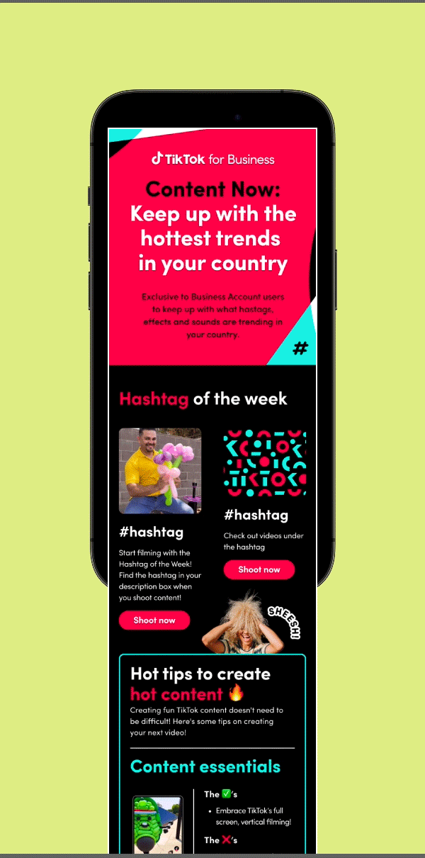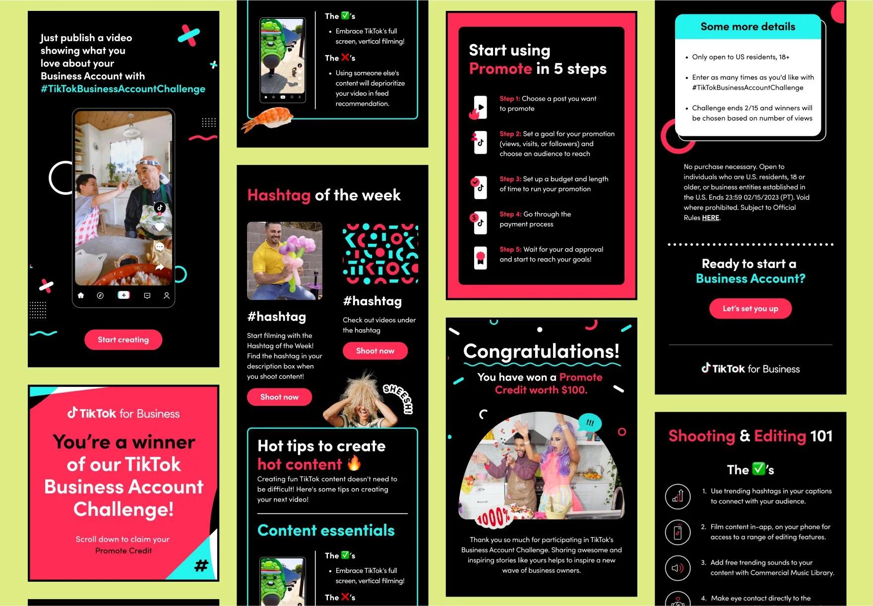 Giving our business account users very clear direction and planning as to what next steps should be taken with alignment of their own personal goals overview. In addition, design emails and H5 landing pages in tandem while following the TikTok brand guidelines.
