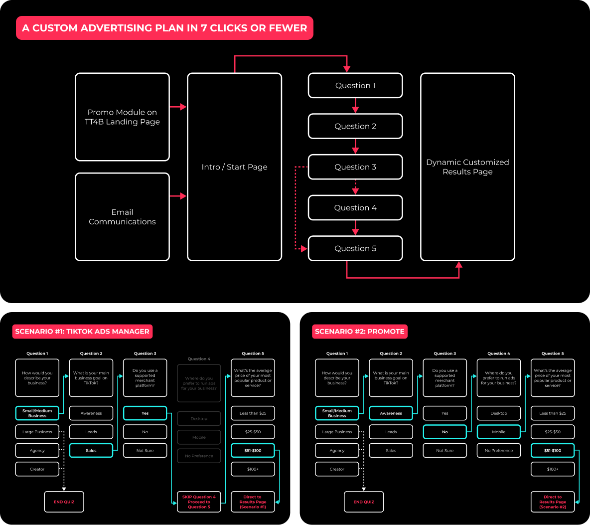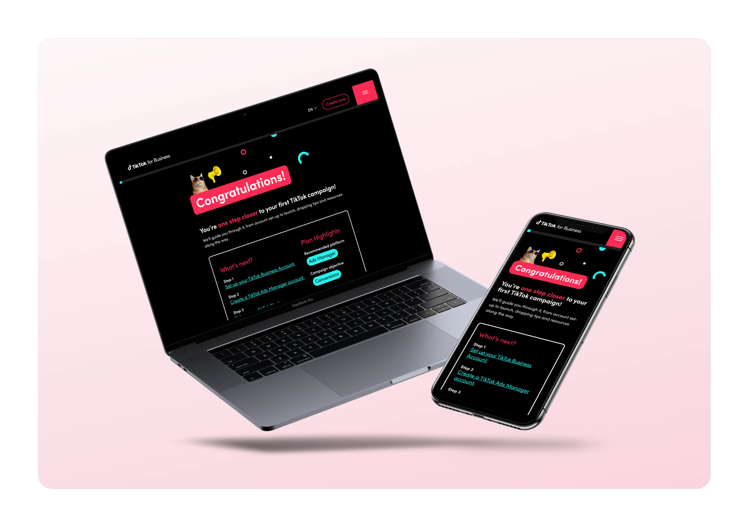 As TikTok continues to grow, so do the number of business account users. TikTok came to our team with a project in mind to develop a guided, digital experience that provides new SMB advertisers with an actionable, personalized, and easy-to-follow plan to get their business started advertising on TikTok.