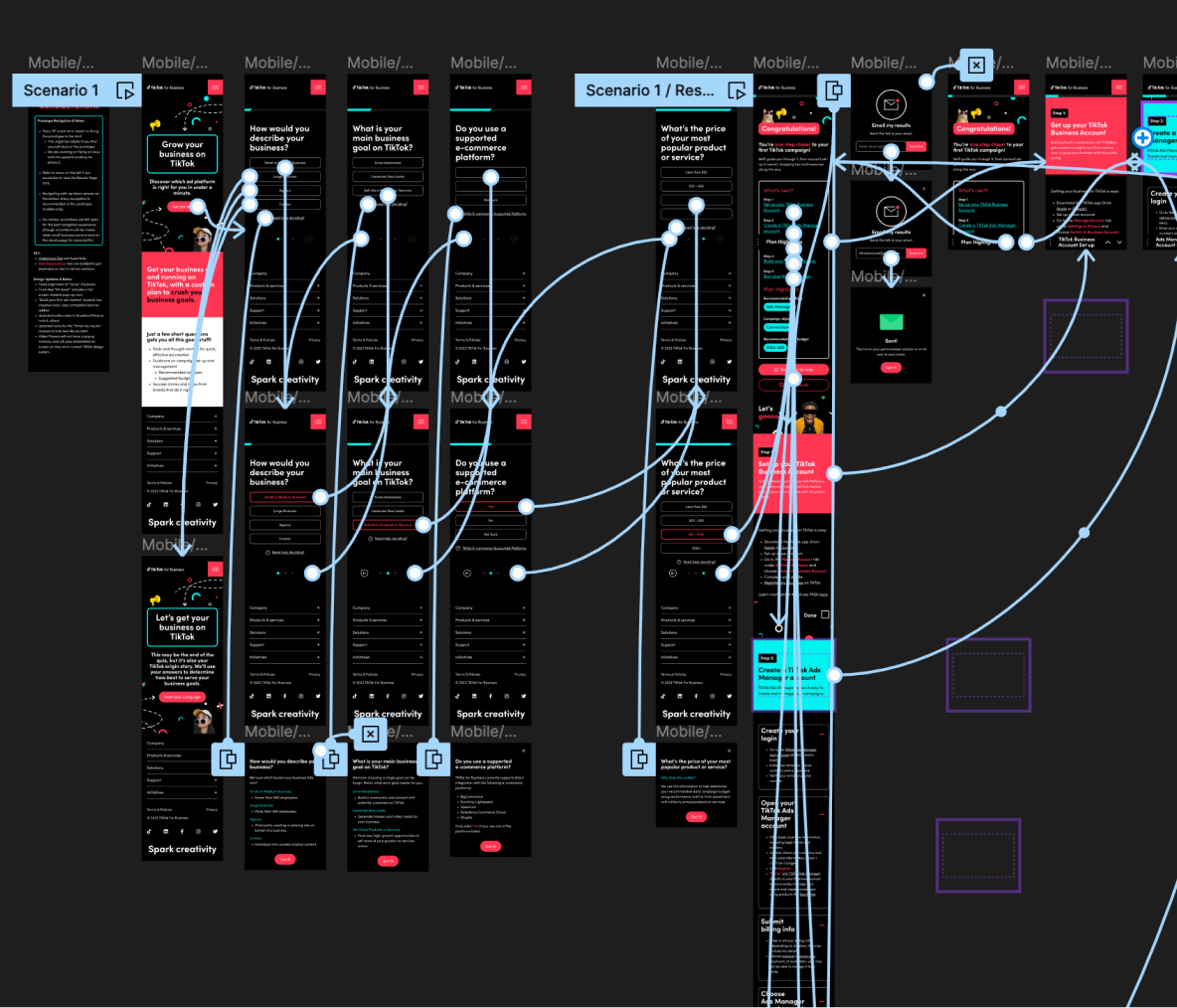 Using our internal style library, we opted to create high-fidelity wireframes and then go straight into the prototyping phase once the design and style was approved by client from there. The ask was to create a total of four prototypes for final delivery; scenario #1 TikTok Ads Manager (desktop and mobile), scenario #2 Promote (desktop and mobile).